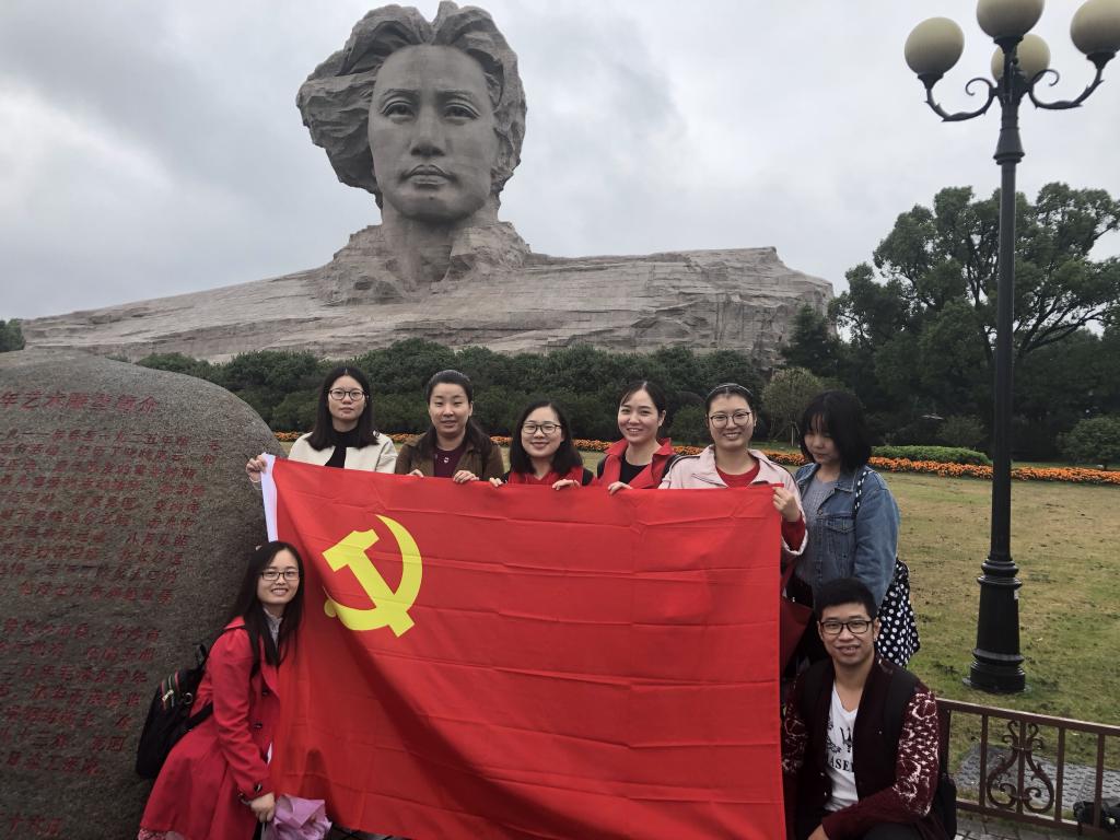 10月20日上午八点半,党员同志们兴致高昂,在数学院集合后前往橘子洲红色基地。下着淅淅沥沥的秋雨,但这丝毫没有减少同学们的热情。到达毛泽东艺术雕塑前,党员同志们均被深深吸引,据介绍,青年毛泽东沉思的表情暗含了他心忧天下的情怀,宽阔的肩膀体现了青年毛泽东的胸怀大志,寓意站在巨人的肩膀上,缅怀历史,放眼未来。大家流露出对伟大人物了解的迫切心情。