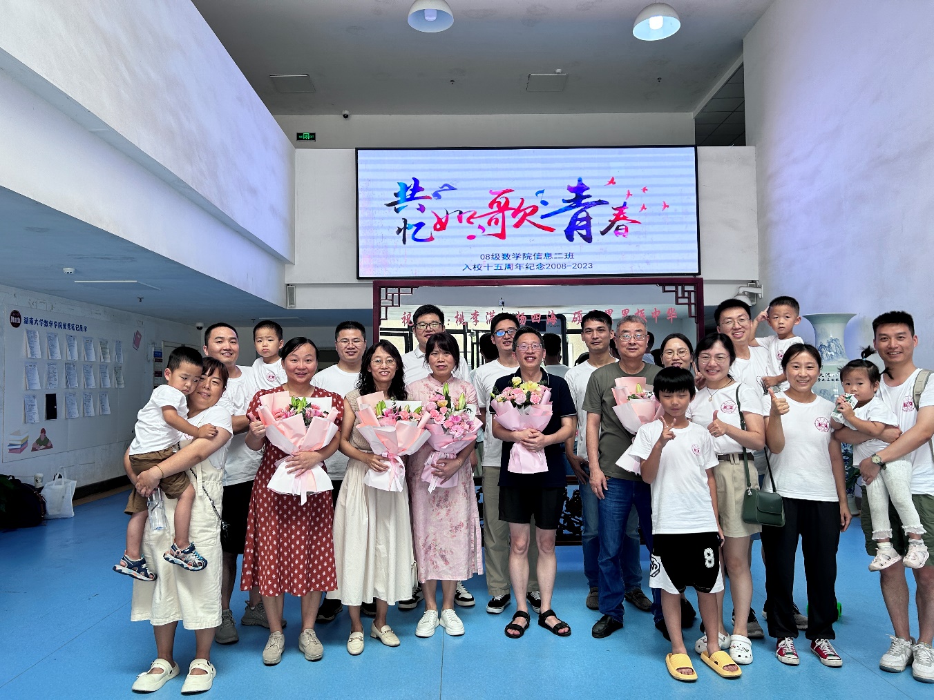 8月19日至20日周末,信息与计算科学2008级2班的同学回到母校举行了入学15周年的“共忆如歌青春”聚会活动。去年他们原本商量好组织毕业十周年纪念活动,因为疫情原因而未能成行。19日下午,他们来到yl23455永利集团425会议室,与老师们一起欢聚一堂,座谈交流,回忆大学的学习和生活,副院长雷渊以及宋怀玲、罗汉、朱郁森、姚兰、蔡明杰等当年的任课老师应邀出席了座谈会,425还开通了视频会议,在深圳出差和在国外不能前来的校友,也在线上参加了座谈。