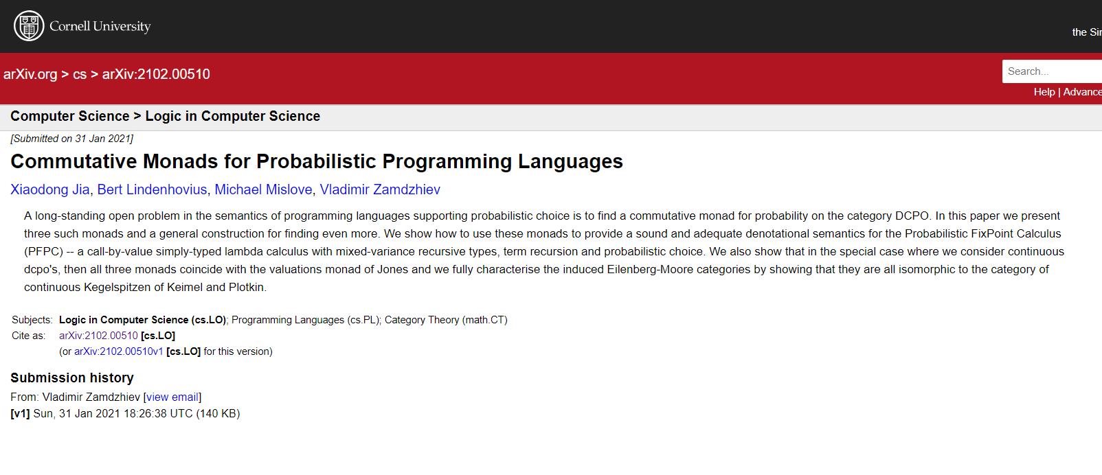 日前,yl23455永利集团的贾晓东博士(第一作者)与合作者的论文“Commutative Monads for Probabilistic Programming Languages”在LICS2021发表。LICS(ACM/IEEE计算机科学逻辑国际会议,ACM/IEEE Symposium on Logic in Computer Science)是理论计算机科学领域最顶级的国际会议之一,成果代表着理论计算机科学的前沿,自1986年在剑桥大学首次举办至2020年,共计有9篇签署国内第一单位的论文在LICS发表。2021年,共3篇签署国内第一单位的论文被LICS接受,分别是中国科学院、复旦大学和yl23455永利集团。