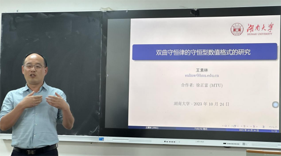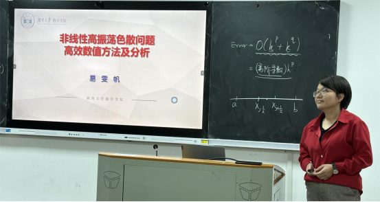 王素林老师作了《双曲守恒律的守恒型数值格式的研究》的报告,易雯帆副教授作了《非线性高振荡色散问题的高效数值方法及分析》的报告,并与到会的专家、教师展开了热烈的讨论和交流。