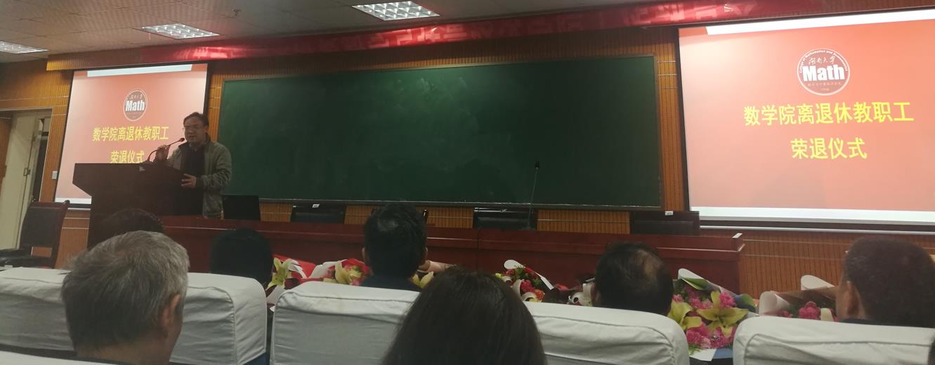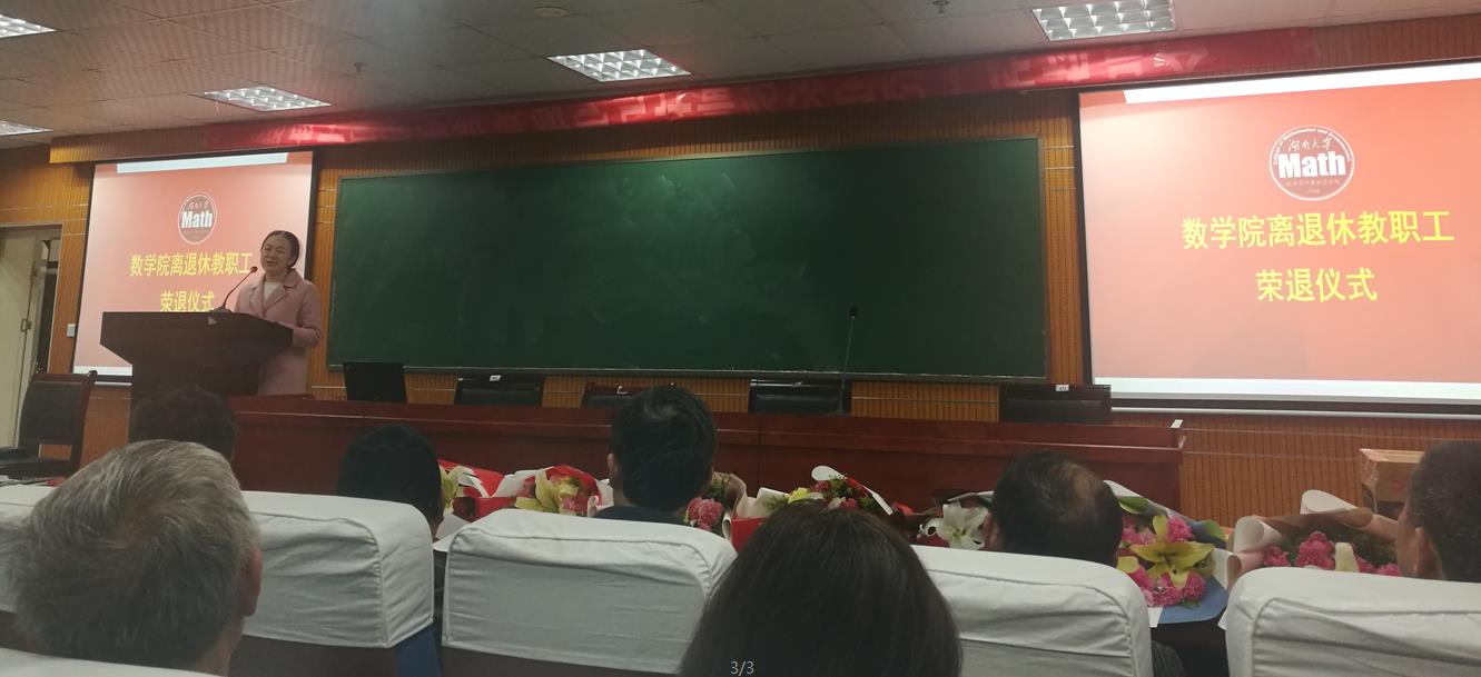 接下来欢送会进入高潮,八位退休教师上台,蒋月评院长和程卓蕾书记为每一位老师颁发了“光荣退休”的荣誉证书。年轻教师上台献花,这一幕意味着传承,数学院的接力棒也将逐步传递给年轻教师。献花结束后,胡跃荣老师作为退休教师代表上台,感谢学院领导和同事的关心。他说自己已经在湖大工作了一辈子,对yl23455永利集团、对数学院有着深厚的情怀,自己一定把退休的生活过好,学院只要有需要他会随时出现。