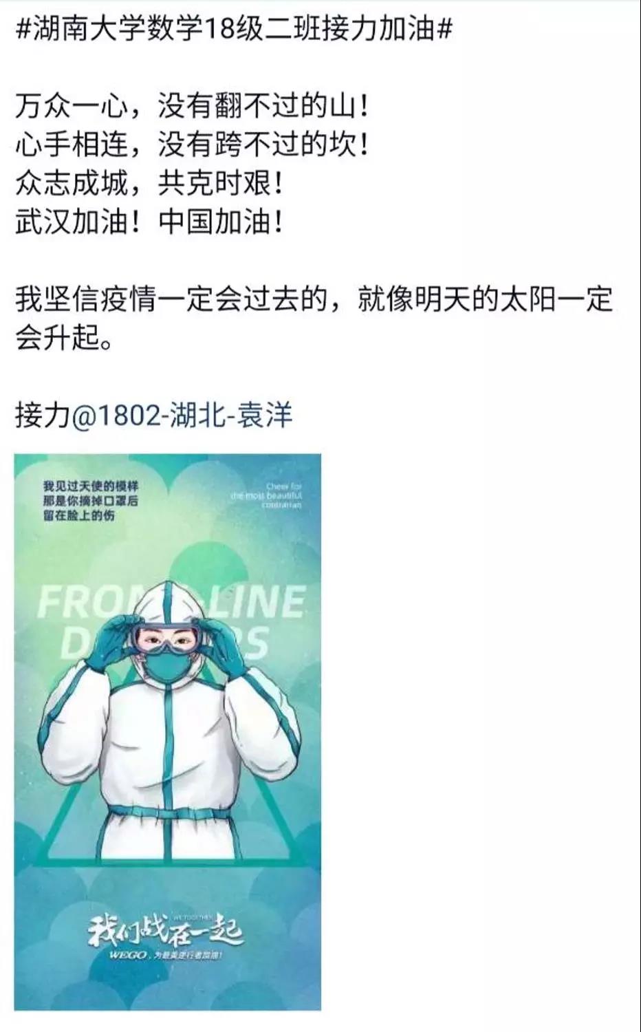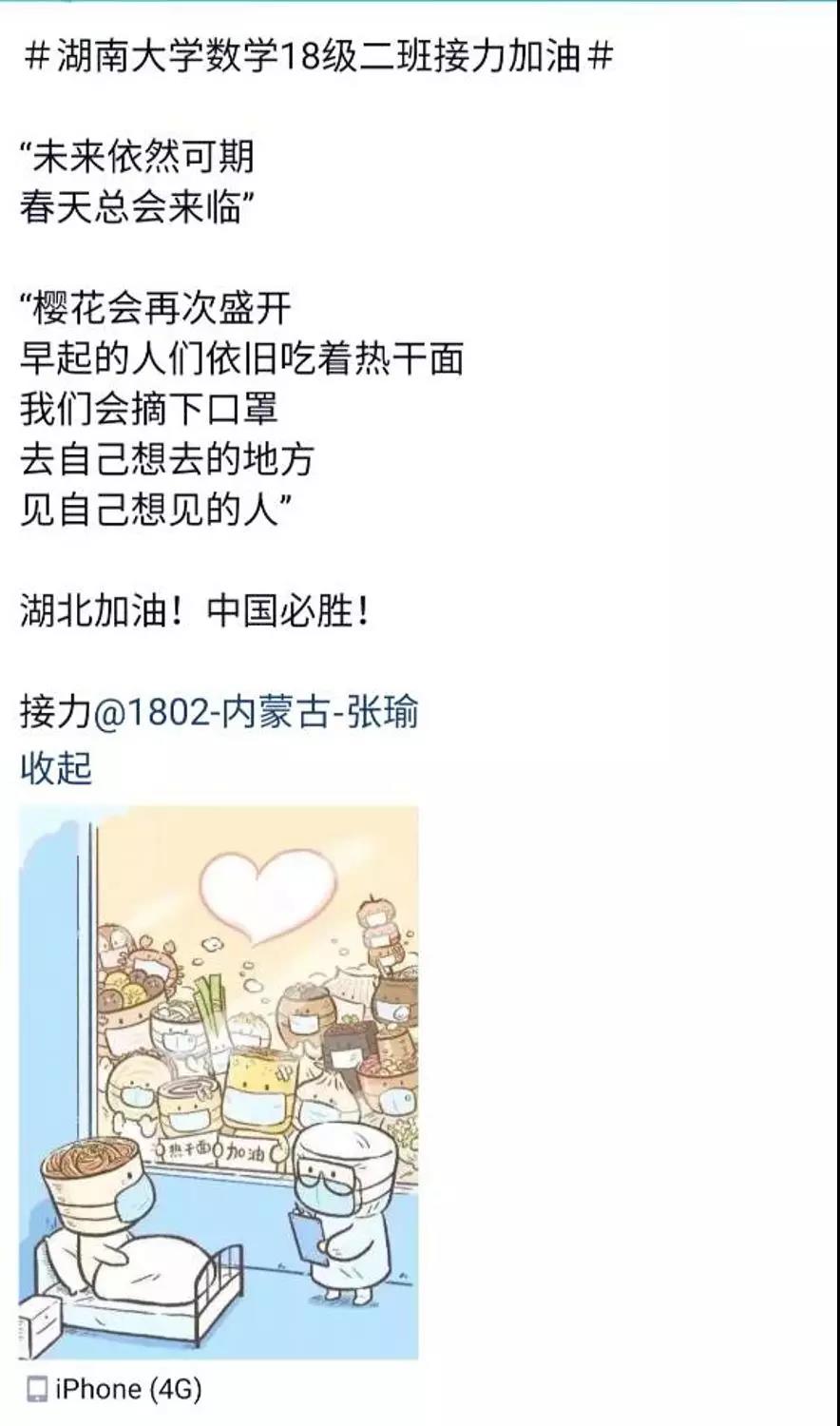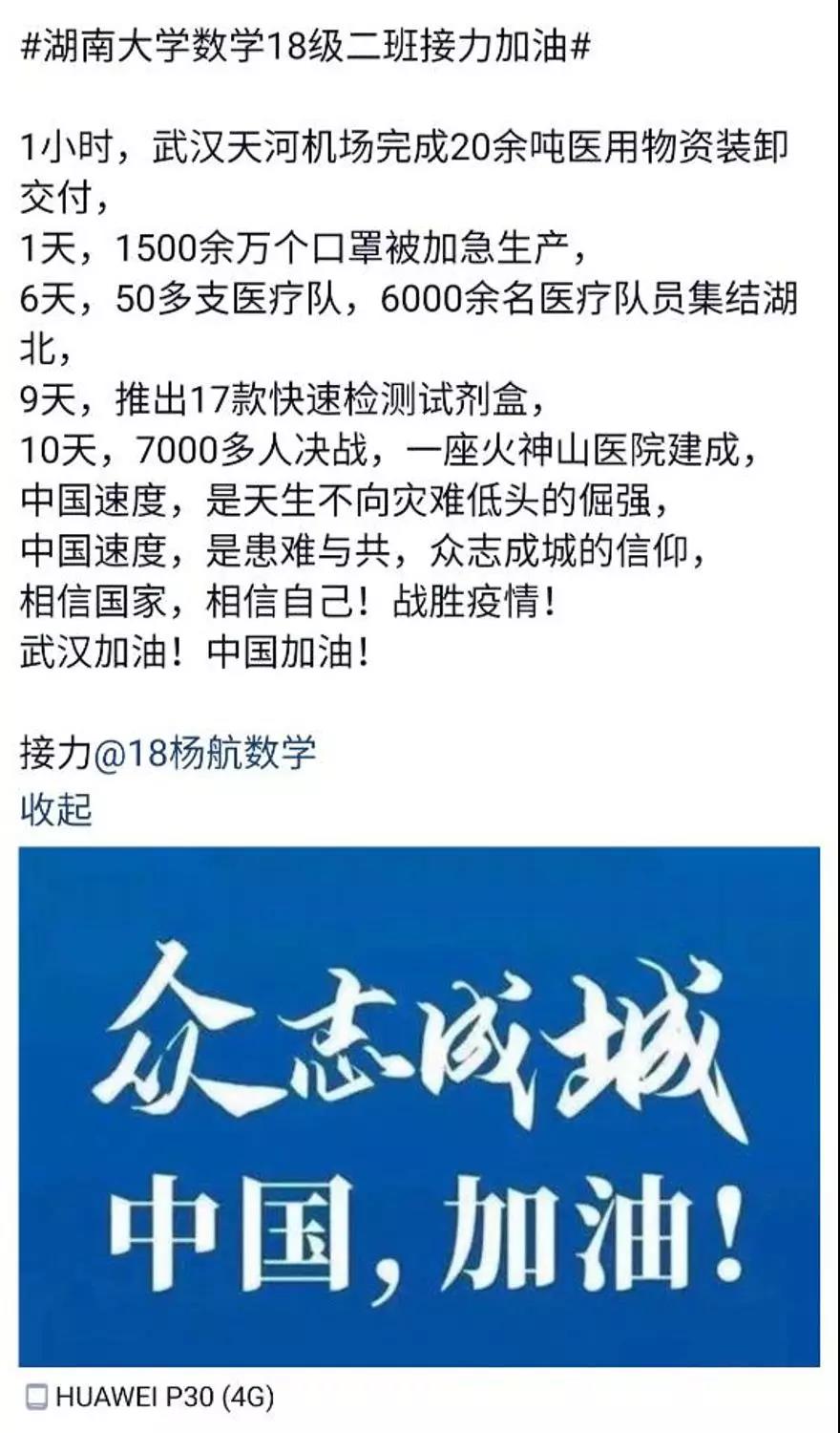 近日,yl23455永利集团数学院1802班的同学们自发组织了一场线上“接力加油“活动,为中国祈福,为武汉加油!