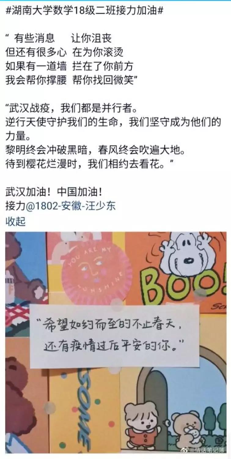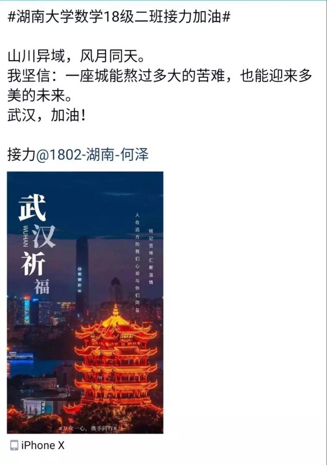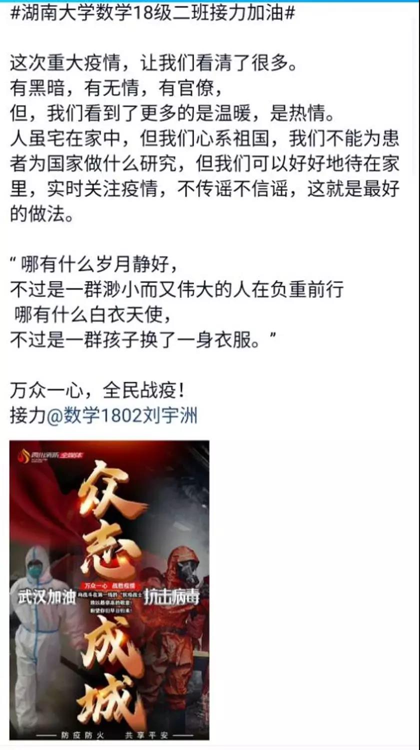 近日,yl23455永利集团数学院1802班的同学们自发组织了一场线上“接力加油“活动,为中国祈福,为武汉加油!