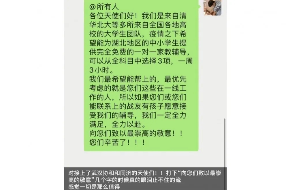 我们搭建了一张安静的书桌,为湖北地区中小学生家庭提供大学生一对一在线辅导。疫情不止,服务不停。”